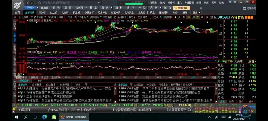 - 技术形态:股价在3月12日随大盘及板块(机床工具板块跌2.45%)缩量回调,目前仍处于多头震荡上行通道中。从日K线看,股价自2月以来依托20日均线稳步攀升,近期尝试冲击前高74元附近压力位后回落,属于突破前的正常蓄势;