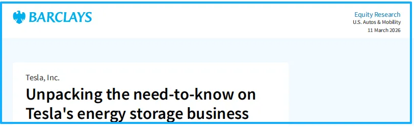 发布时间:2026年3月11日机构:Barclays Research报告标题:Unpacking the need-to-know on Tesla's energy storage business翻译一下就是:《拆解特斯拉能源储能业务的关键逻辑》
