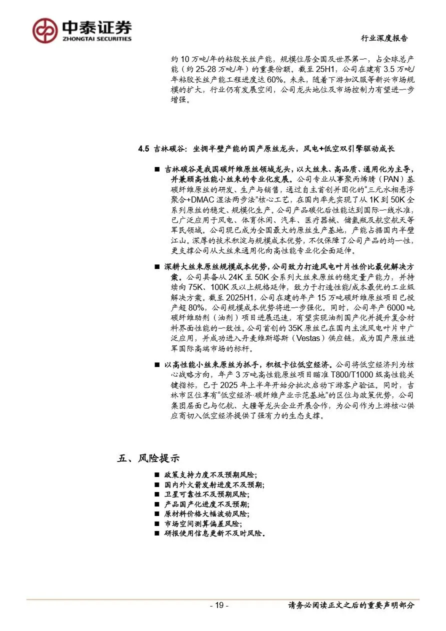 面对商业航天市场的快速增长,碳纤维行业正经历着技术突破与国产替代的双重驱动。当前,全球航天级碳纤维供给高度集中在日美等少数企业手中,技术壁垒与出口管制限制了国内市场的供应。然而,近年来国内企业在高模量碳纤维领域取得了显著进展,成功实现了M55J级碳纤维的技术突破与批量生产,打破了国外垄断。报告分析指出,随着国内星座部署计划的推进,中期MJ级碳纤维仍将处于供不应求状态,国产替代空间巨大。在此背景下,光威复材、中复神鹰等国内龙头企业凭借技术积累与产能扩张,正加速抢占商业航天碳纤维市场,有望在未来几年内实现显著增长,推动中国商业航天产业的自主可控与高质量发展。