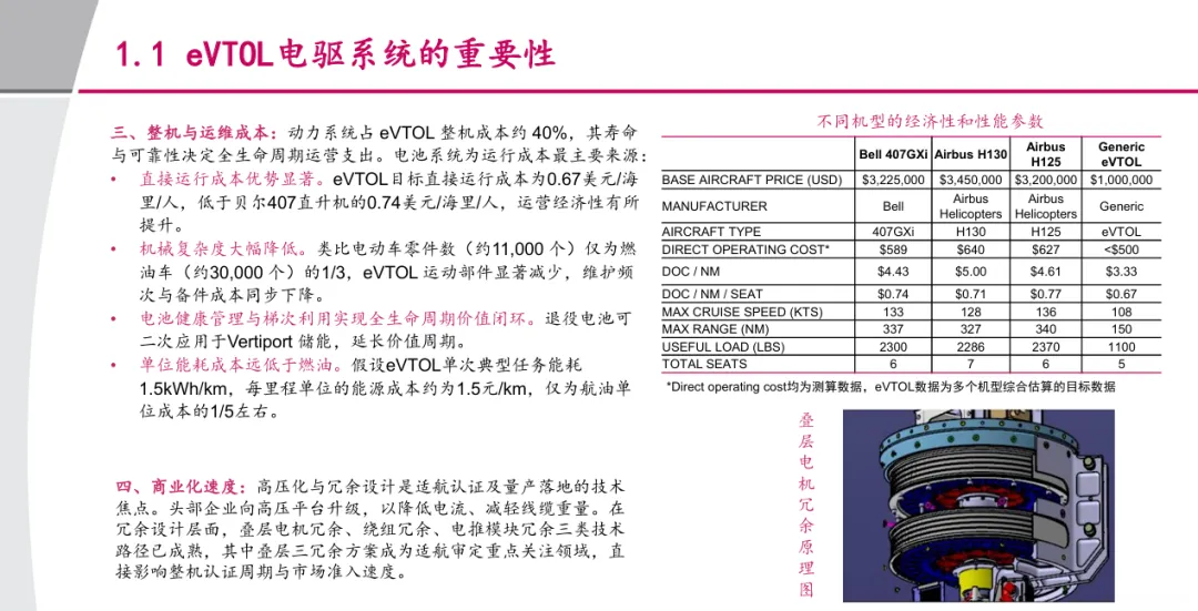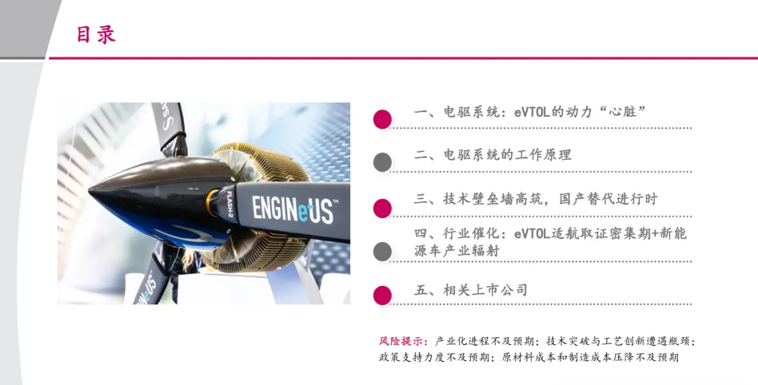 摘要:本报告全面剖析 eVTOL 电驱系统的技术、产业与投资价值。eVTOL 电驱系统作为飞行器 “心脏”,由电机、电控、减速器构成,占整机 BOM 成本约 40%,直接决定飞行安全、续航、载重及商业化进程,是技术壁垒最高、国产替代空间最大的环节。核心需求聚焦高功率密度(目标 7kW/kg)、轻量化、航空级高可靠性(失效率≤10⁻⁹次 / 飞行小时)与长寿命,技术路线呈现 800V-1000V 高压化、SiC 器件集成、轴向磁通电机应用等特征。行业正迎来多重催化:2026-2027 年 eVTOL 适航取证密集期开启市场空间,新能源车产业技术辐射(SiC 量产、高压电机经验复用)推动成本下降与性能升级。海内外对比来看,国内厂商在成本控制、量产能力上具备优势,海外在适航认证与复杂布局匹配上领先,国产替代关键在于轴向磁通电机量产良率与航空级电控适航认证突破。报告梳理卧龙电驱、湘电股份、英博尔等核心企业布局,为投资者提供技术演进与产业链投资参考。