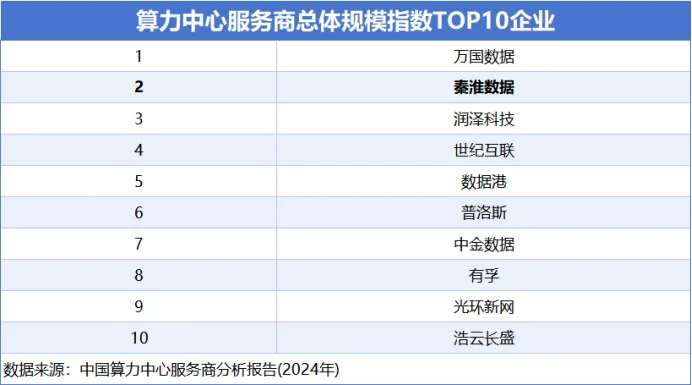 2024年,秦淮数据在国内数据中心市场规模排名第二,仅次于万国数据。