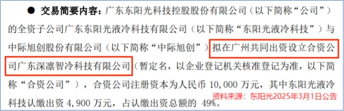 2025年3月,东阳光与中际旭创共同出资1亿元成立合资公司,旨在整合技术研发、产业及客户资源,以此为切口进一步切入智算中心液冷赛道,抢占全球液冷产业链的核心环节。