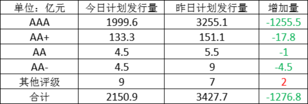 今日存单计划发行量规2150.9亿元,较上一工作日计划发行量大幅减少,减少了1276.8亿元。