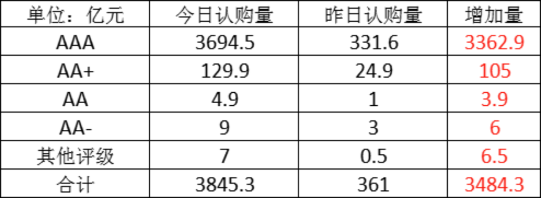 今日存单认购量规模3845.3亿元,较上一工作日认购量大幅增加,增加了3484.3亿元。