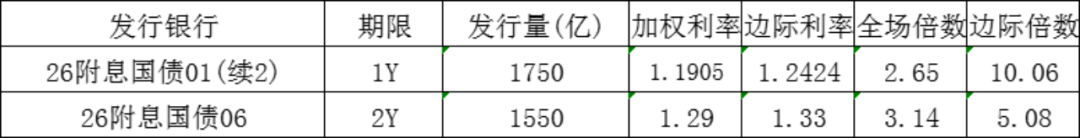 今日财政部发行1年政策性金融债,发行量1750亿元,发行利率1.2424%,投标倍数2.65倍,边际倍数10.06倍;财政部发行2年政策性金融债,发行量1550亿元,发行利率1.33%,投标倍数3.14倍,边际倍数5.08倍。