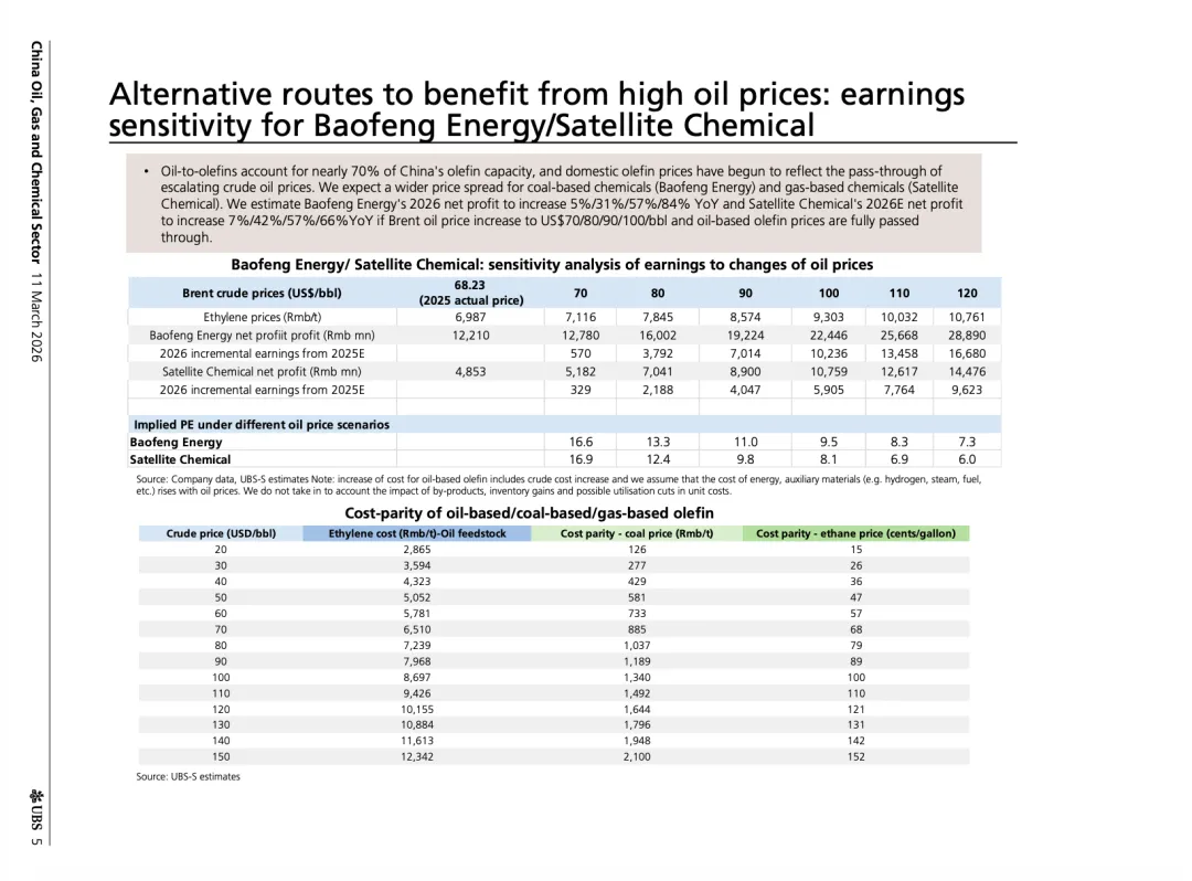 当油价上涨时:油制成本迅速上升。而煤制成本基本不变。于是煤化工企业利润突然爆炸。根据瑞银测算,如果油价涨到100美元: