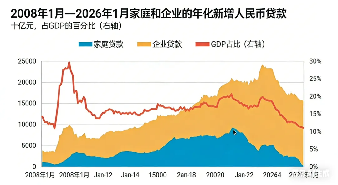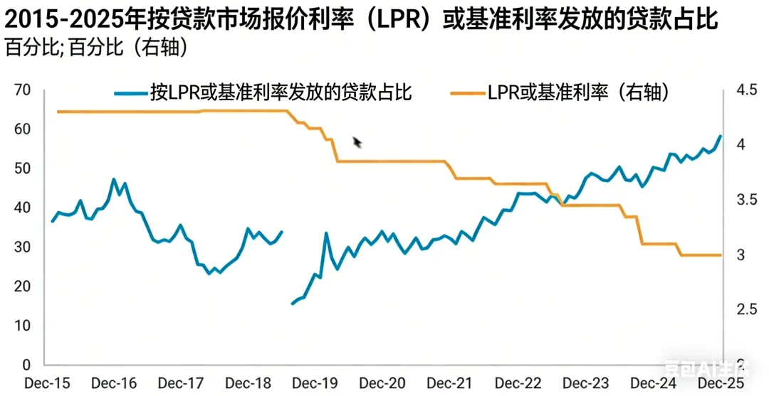 研报中关于金融体系的分析标题为“Doing less with less”,当前金融体系处于边际效用递减状态,长期以投资为主导的经济发展模式难以为继,M2高增长无法转化为有效社会融资需求,金融体系规模庞大但运行效率持续走低。银行资产规模增速数据:2007年到2016年,中国所有商业银行加权平均资产规模年均增速达18.1%,2017年到2024年期间降至年均9%,增速近乎腰斩;2025年到2026年早期,该数据继续创新低。研报认为,这一方面是因为体量增大后高增长难度提升,另一方面与信贷结构问题相关。贷款利率相关分析:LPR(贷款利率)持续下行,但19年到25年期间,低于LPR发放的贷款占比持续上升,当前LPR为3%,越来越多贷款以低于3%的利率发放。研报指出,这表面反映市场中愿意支付高息的借款人减少,深层原因是长期信贷双轨制:国央企有政府信用背书,偿债风险低,银行愿意以低利率放贷;民营企业缺乏此类背书,风险更高,贷款利率长期偏高。当前低利率贷款占比提升,实则反映民营经济贷款需求大幅萎缩,国央企成为银行放贷的主要对象,而国央企整体运行效率低于民营企业,导致大量金融资源配置给低效主体,推动金融体系逐渐僵尸化。新增贷款规模变化:以12个月滚动平均总和为指标,新发放贷款在2023年上半年触顶,达24万亿,最新数据降至15.6万亿,社会贷款意愿明显下行。其中居民部门新增贷款从2021年起持续下行,核心原因是房地产市场收缩,居民购房意愿降低,且在缺乏优质理财产品的情况下,更多居民选择提前偿还贷款。推演逻辑:当前市场以低效央国企为主导,高回报投资标的稀缺,投资机会减少导致新增贷款规模下降;同时信贷双轨制下,愿意支付高息的民营企业和居民部门客群萎缩,只剩国央企以低利率贷款,挤压银行净息差,导致银行利润下行,进而削弱银行承担风险和信用派生的能力,形成“贷款越少→利润越低→放贷能力越弱→贷款更少”的恶性循环,拖累投资端和整体经济增长。研报预测,2026年金融体系的僵尸化和衰退状态仍将持续并加深。