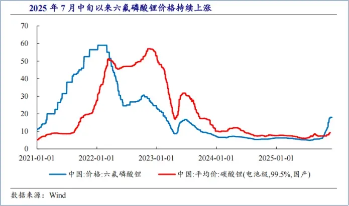 2025年7月以来,六氟磷酸锂的价格持续上涨,7月价格在5万元/吨左右,到了年末已涨至18万元/吨左右,涨幅高达260%。