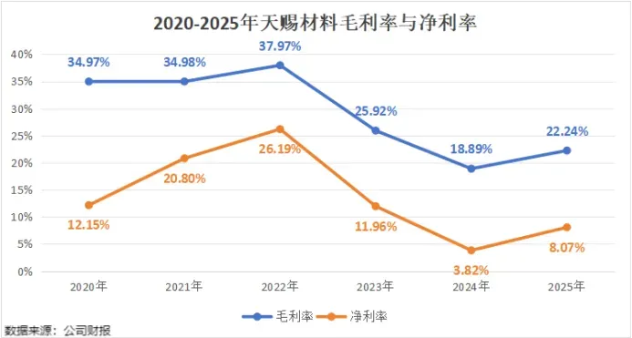 从毛利率来看,2025年天赐材料的毛利率达到22.24%,较去年提升四个百分点,其中四季度单季毛利率飙升至30.12%,推动净利率从2024年的3.82%提升至8.07%。