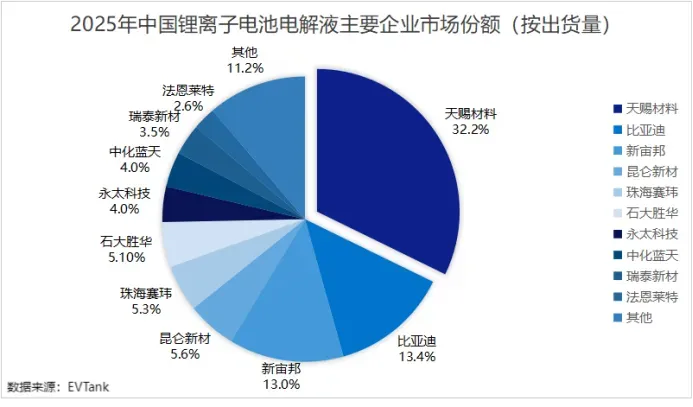 天赐材料、比亚迪、新宙邦三家企业占据了接近60%的市场份额,其中天赐材料以32.2%的份额稳居国内第一。