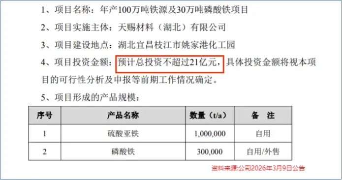 根据公告,天赐材料拟通过天赐材料(湖北)有限公司在湖北宜昌建设新能源材料产业园,建设内容包括年产100万吨铁源及30万吨磷酸铁项目,预计总投资不超过21亿元。