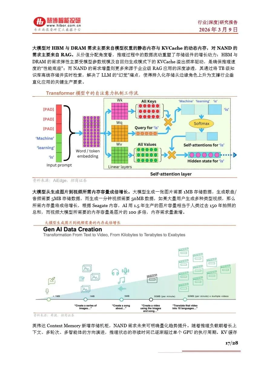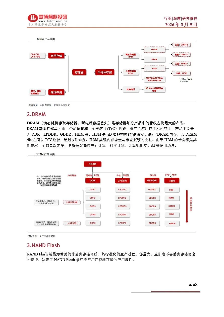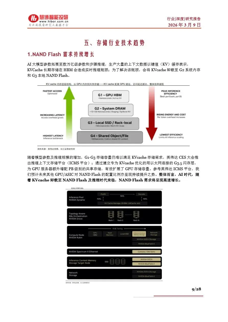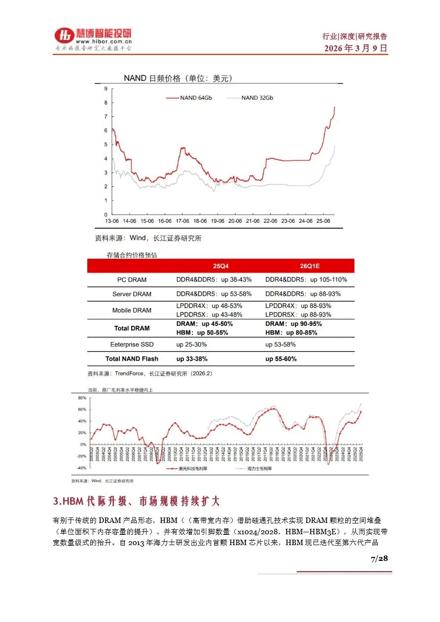 存储行业目前正处于一个前所未有的“超级周期”中,受AI算力需求激增的驱动,全球存储芯片市场供不应求,价格持续上涨。DRAM和NAND Flash作为主流存储芯片类型,其现货价与合约价均呈现显著增长态势,尤其是HBM(高带宽内存)作为DRAM的高端产品,因其在AI服务器中的广泛应用,成为市场增长的新引擎。随着AI大模型参数的不断拓展,对存储容量和带宽的需求急剧增加,推动了NAND Flash在数据中心的重要性日益凸显。未来,随着HBM技术的持续迭代和产能的逐步释放,以及NAND Flash在AI推理中的广泛应用,存储行业将迎来新一轮的增长高潮,市场规模有望在2026年突破3000亿美元大关。