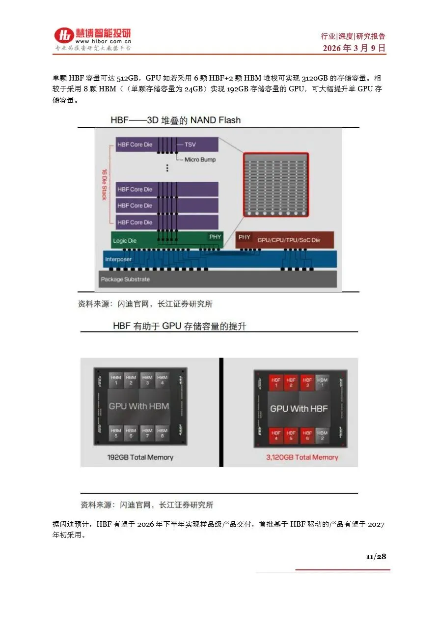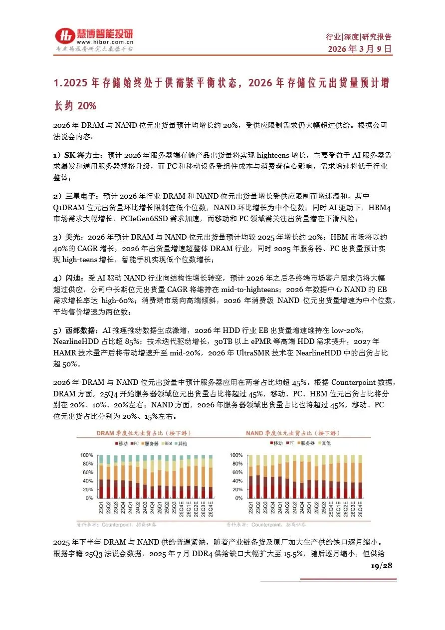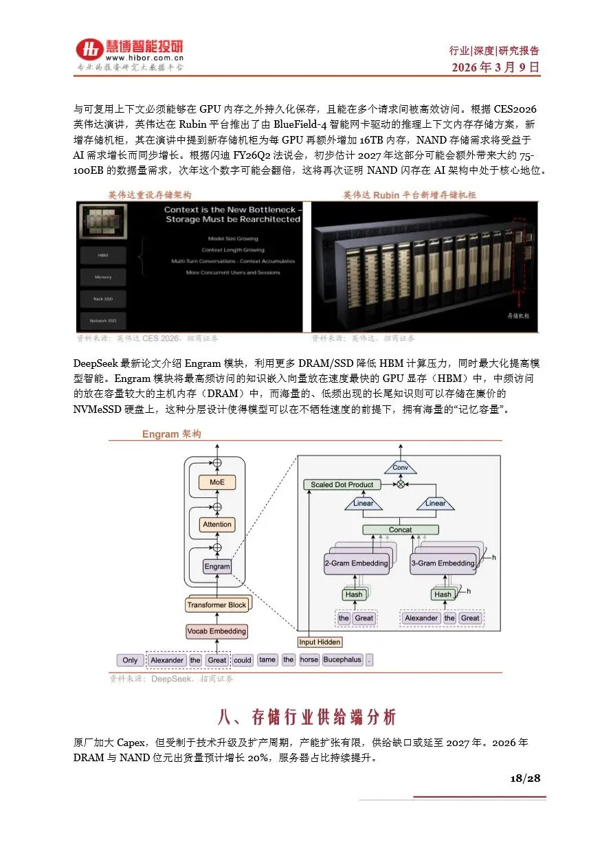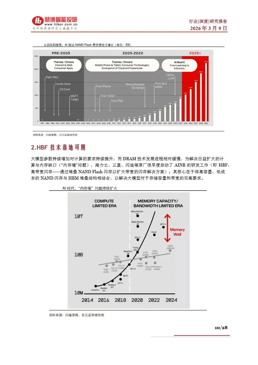 存储行业目前正处于一个前所未有的“超级周期”中,受AI算力需求激增的驱动,全球存储芯片市场供不应求,价格持续上涨。DRAM和NAND Flash作为主流存储芯片类型,其现货价与合约价均呈现显著增长态势,尤其是HBM(高带宽内存)作为DRAM的高端产品,因其在AI服务器中的广泛应用,成为市场增长的新引擎。随着AI大模型参数的不断拓展,对存储容量和带宽的需求急剧增加,推动了NAND Flash在数据中心的重要性日益凸显。未来,随着HBM技术的持续迭代和产能的逐步释放,以及NAND Flash在AI推理中的广泛应用,存储行业将迎来新一轮的增长高潮,市场规模有望在2026年突破3000亿美元大关。