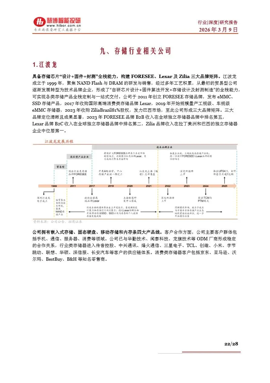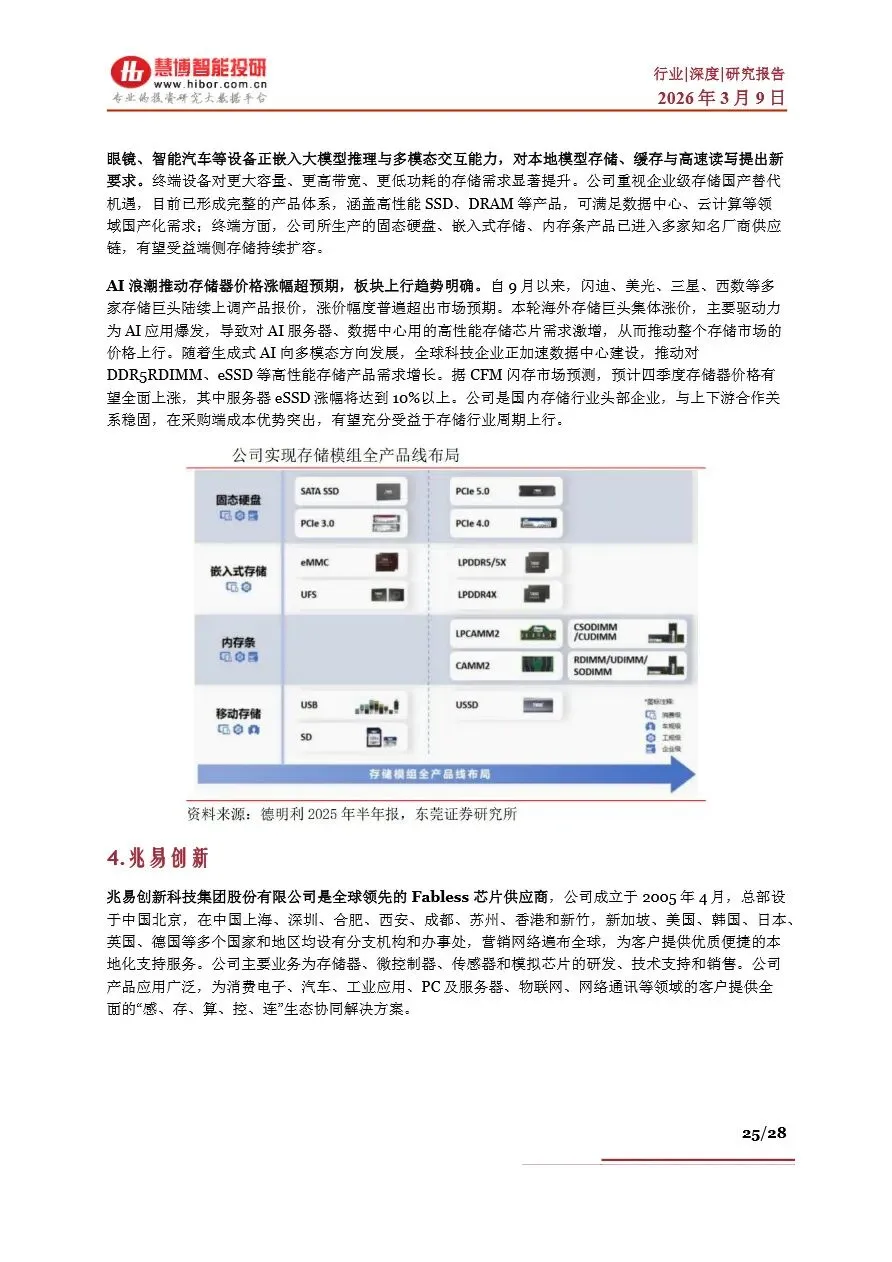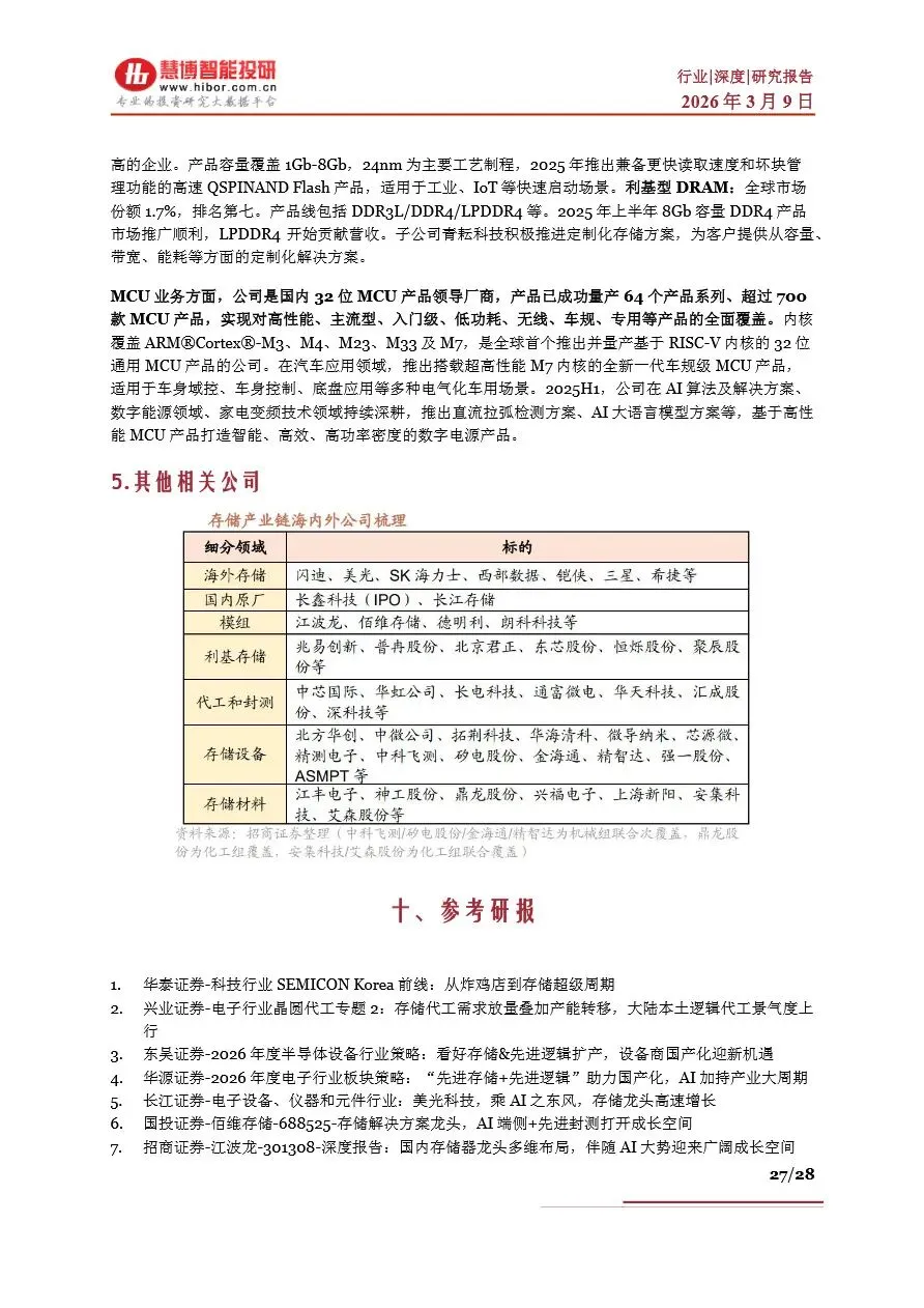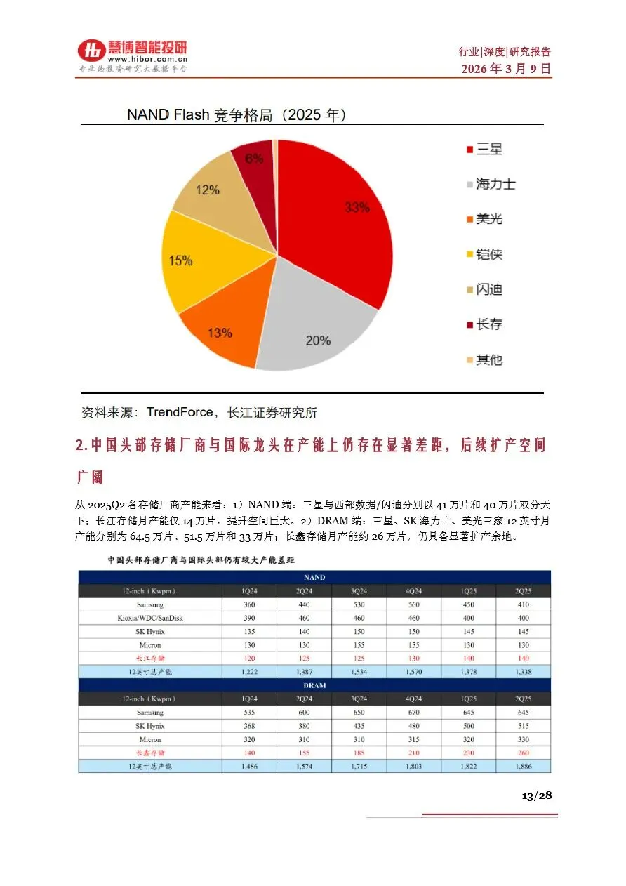 存储行业呈现出高度寡头竞争的格局,全球市场被少数几家海外大厂主导,如三星、海力士、美光等,在DRAM和NAND Flash领域占据绝大多数市场份额。这些企业通过巨额资本投入和技术创新,不断巩固其市场优势。相比之下,中国存储器产业起步较晚,但近年来在政策支持和资本投入下,以长江存储、长鑫存储为代表的中国企业实现了技术突破和产能扩张,逐步缩小与国际龙头的差距。存储产业链上游为晶圆原厂,掌握核心制程工艺和产能资源;中游为存储器厂商,通过主控芯片设计、固件开发及封装测试等环节,将标准化存储晶圆转化为满足不同应用场景的存储产品;下游则为各类电子产品制造商。随着AI技术的普及,存储产业链各环节企业正加强合作,共同推动技术创新和产品升级,以满足市场对高性能、大容量存储解决方案的迫切需求。