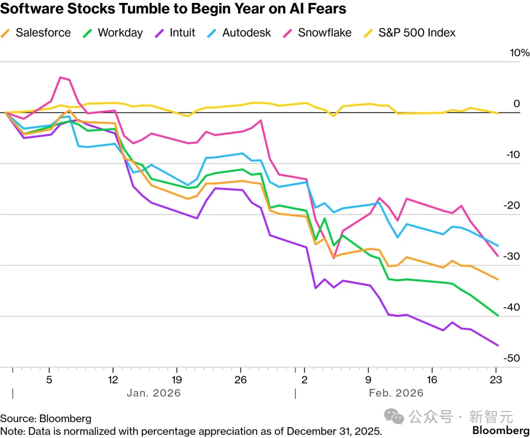 上图中,Bloomberg统计了2026年1月5日到2026年2月23日以来,美国软件巨头股价变动情况: