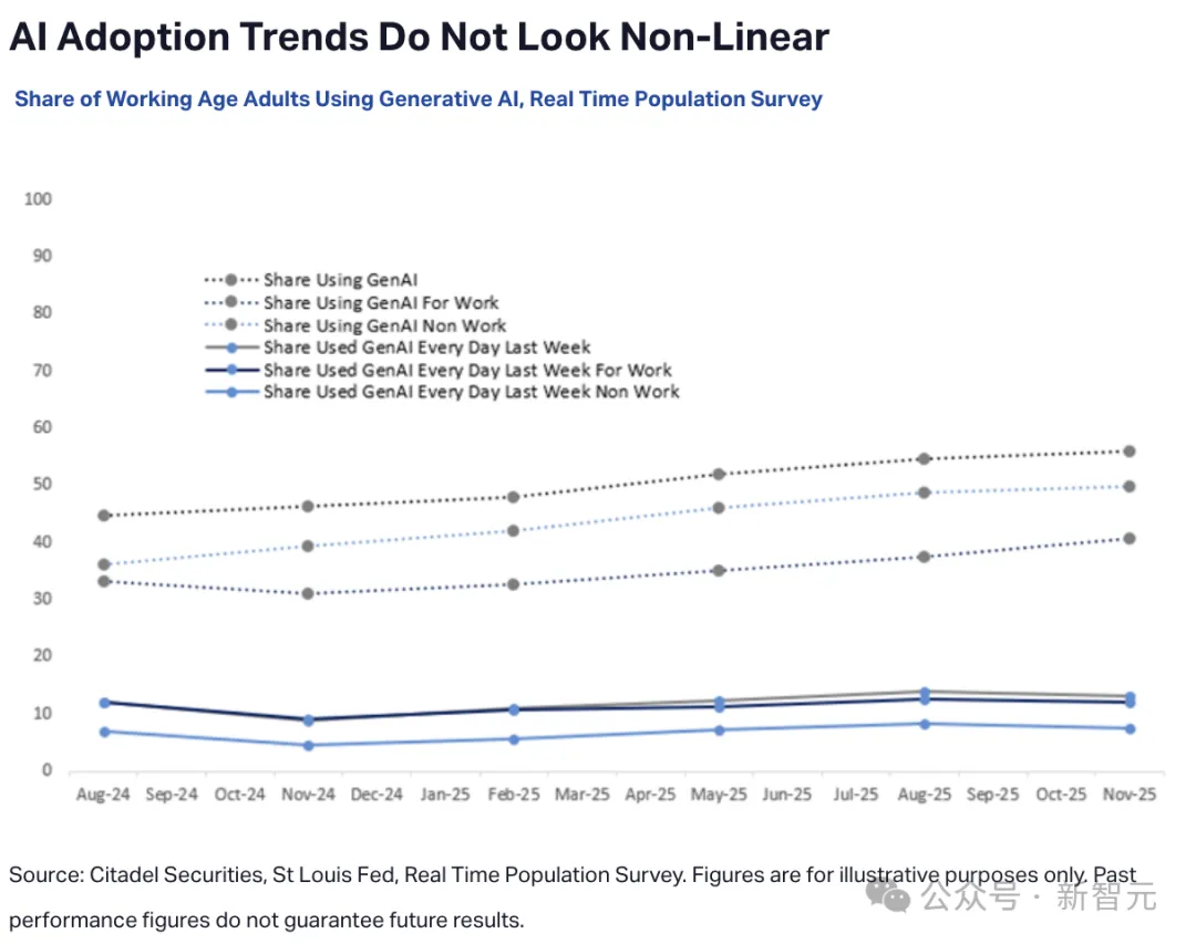 这组数据不问你用不用AI,而是问你在工作中使用AI的频率到底有多高。如果AI真的马上要取代人类,那么员工每天使用AI的比例应该出现一个极其陡峭的向上拐点。