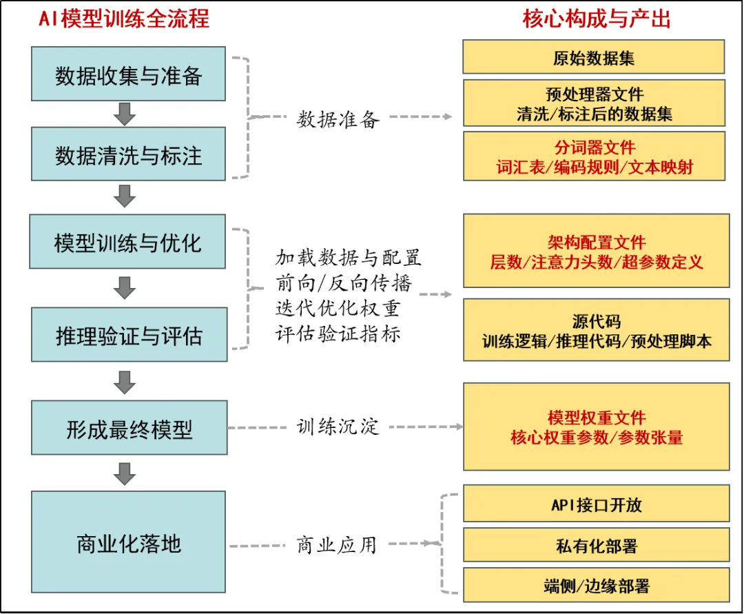 然而,AI模型并非单一的整体,其研发与应用涵盖了复杂的流程。从完整训练链条来看,首先需要准备和标注数据,随后进行模型训练与优化,并结合具体任务目标,在算法和结构等方面对模型进行调整,通过反向传播等机制持续迭代。训练完成后,需经过推理验证,最终得到模型核心的权重文件,通过API或其他形式开放应用,实现商业化落地。从技术构成与实践应用上看,一个完整的AI模型通常以一组可交付文件形式呈现,其中主要包括:模型权重文件、模型架构配置文件、分词器文件以及用于训练和推理的源代码等。这些文件共同组成了模型应用的技术基础,支撑其在实际场景中的部署与运行。