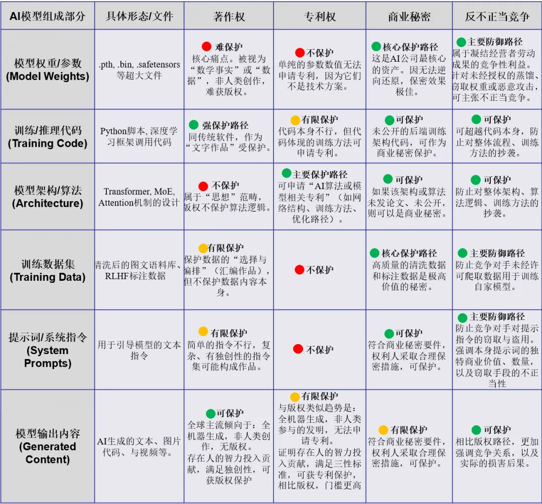 简单来说,需针对AI模型的不同组件,构建差异化的知识产权保护方式。模型的核心权重与参数文件,因其可能被界定为数学事实或数据,在著作权与专利保护上均存在障碍,但其商业价值极高、保密性强且难以反向工程,故商业秘密是其核心保护方式,针对窃取行为可辅以反不正当竞争法救济。