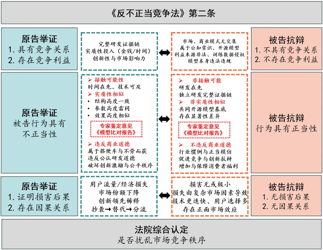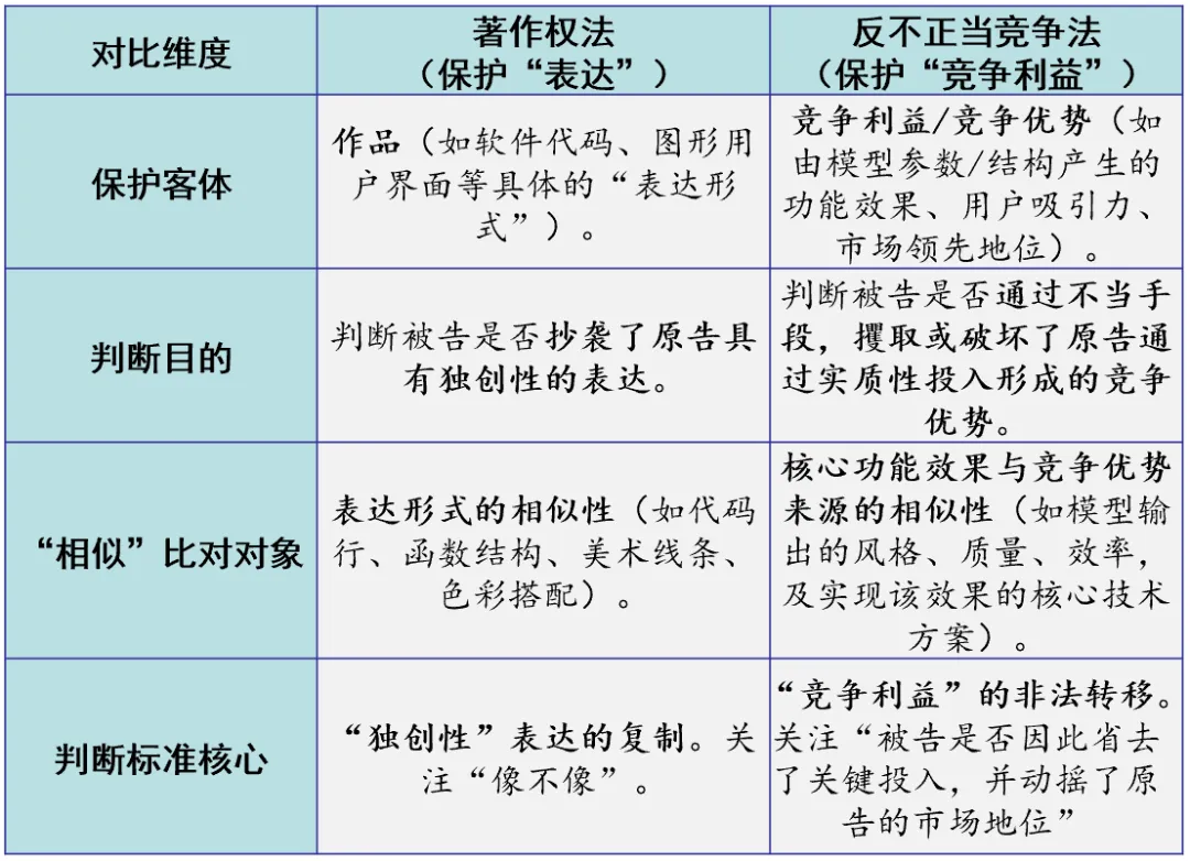 在不正当竞争纠纷案件中,对于实质性相似的判断,虽与著作权法相似,但二者的目的与侧重点不同。著作权法聚焦于表达形式的相似性,遵循“思想与表达二分”原则,保护的是独创性的表达。反不正当竞争法则关注整体功能、效果以及该相似性是否不当侵占了原告的竞争优势。就AI模型而言,其比对范围更广,可涵盖模型输出的质量、风格、核心功能等要素。关键在于,相似部分是否源自原告的实质性投入,并为其带来了独特的市场竞争优势。换言之,只要能够不当转移竞争优势,无论其属于“思想”或“表达”层面,均可纳入考量。因此,反不正当竞争法下的判断是技术与价值的复合判断,既需进行技术特征比对,也需进行价值评估,即被诉行为是否越过了正当模仿的边界,违反了商业道德并破坏了创新秩序。
