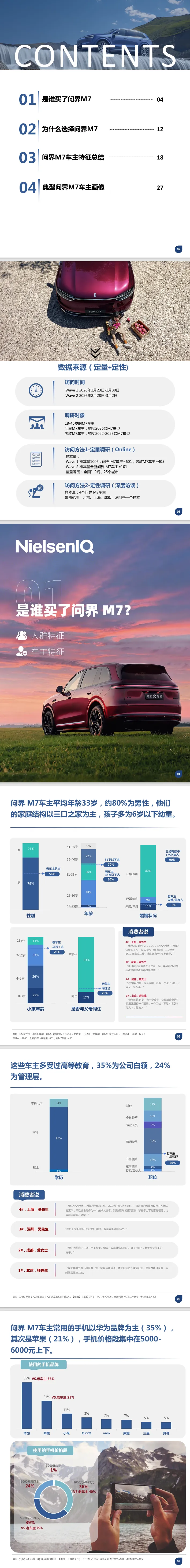 摘要:此报告基于全国1006份调研样本,揭示问界M7核心用户的特征与购车逻辑。车主平均年龄33岁,约80%为男性,以本科及以上学历的公司白领、管理层为主,多为三口之家(孩子0-6岁)。购车核心驱动力为安全性、华为智驾ADS 4.0与大空间,68%选择纯电版本,73%为首购用户且80%全款支付。用车场景集中于亲子出行、短途露营等娱乐场景,偏好零重力座椅、车载K歌等舒享功能,NPS净推荐值达85%,华为的技术加持与高性价比成核心竞争力。
