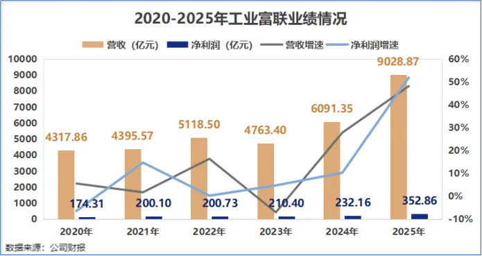 2025年,工业富联营收突破9000亿大关,同比增长48.22%;净利润352.86亿元,同比增长51.99%。
