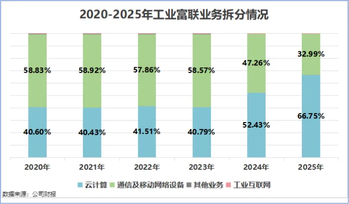 2025年,工业富联的云计算业务实现营收6026.79亿元,同比增长88.70%,占总营收的比重进一步提升至66.7%,成为业绩增长的第一引擎。