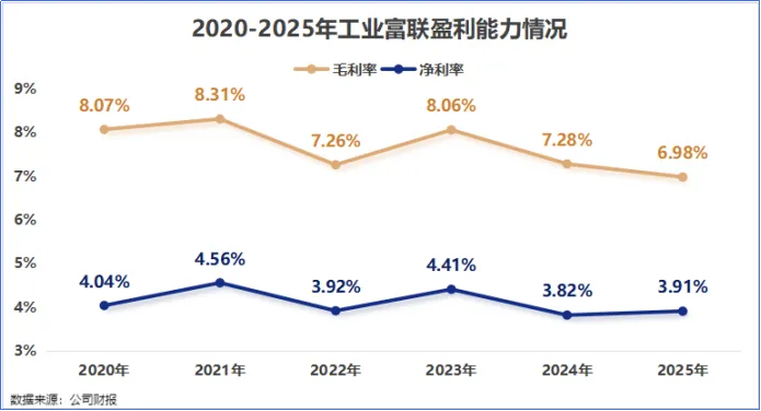 2025年,公司的毛利率仅为6.98%,净利率为3.91%。换句话说,工业富联每开展100元的业务,真正能够收入囊中的利润不到4元。