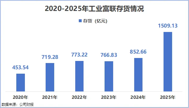 截至2025年末,工业富联的存货规模达到了1509.13亿元,较2024年末增长了76.99%,创下历史新高。