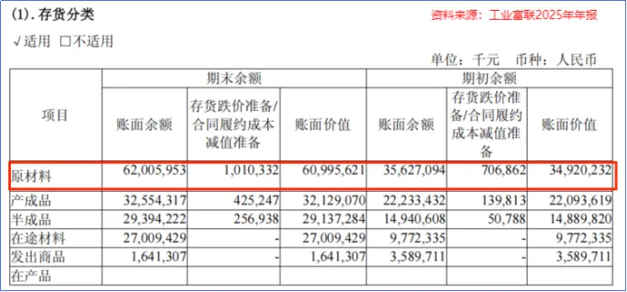 通过拆分工业富联的存货结构,2025年,公司的存货中原材料价值高达609.96亿元,占比高达40.42%,较年初增长了74.67%。