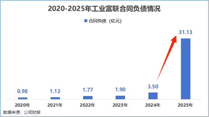 2024年以前,工业富联的合同负债均维持在几亿元规模,到了2025年,这一数据直接飙升至31.13亿元,较2024年直接翻了8倍。