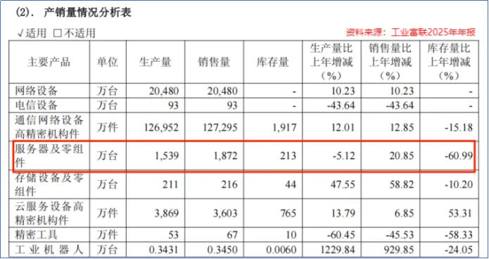 2025年,工业富联服务器及零组件全年生产1539万台,销售1872万台,库存213万台,库存量较上年同期大幅下降60.99%。