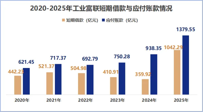2025年,公司的短期借款为1042.29亿元,应付账款为1379.55亿元,分别较年初增加了189.59%、47.02%。