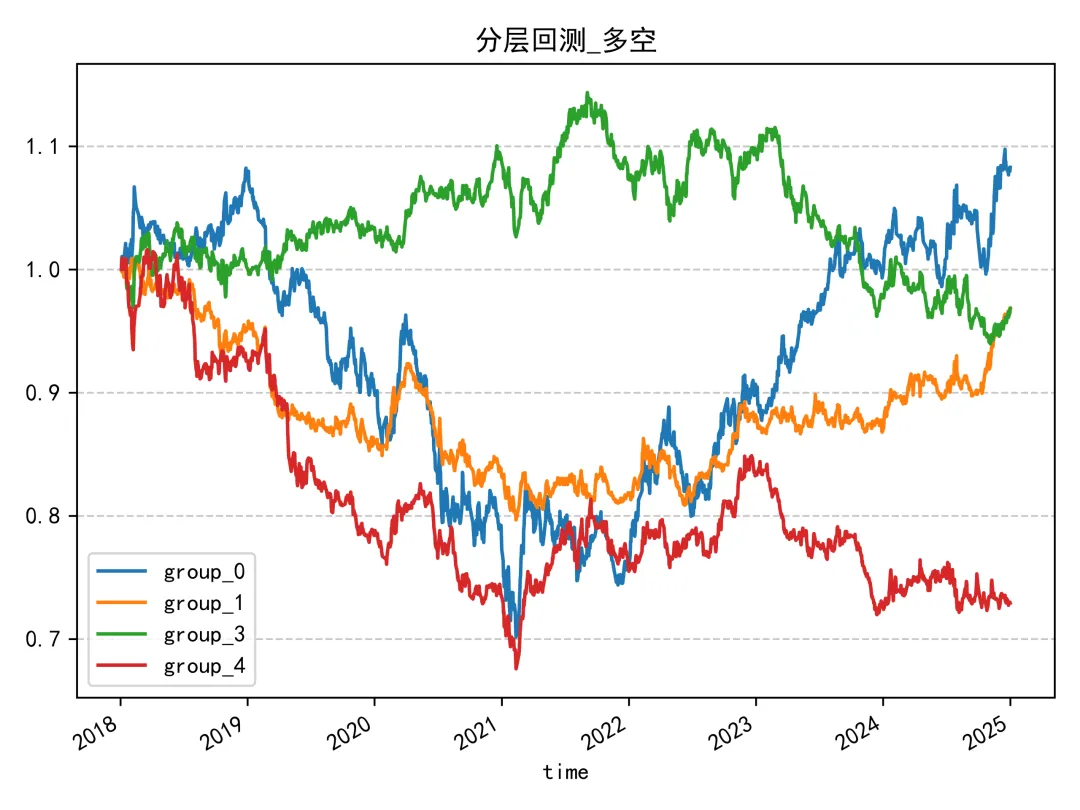 该因子的分层回测没有单调性可言,红线和绿线的净值一直领先其他三组,直到2023年的第二季度才被蓝线超越。