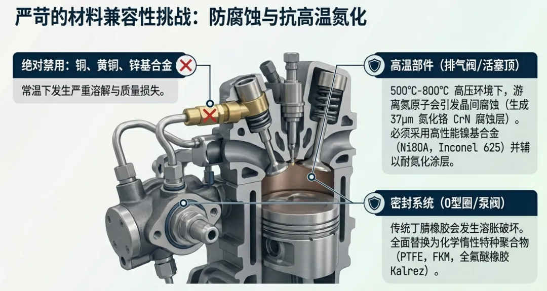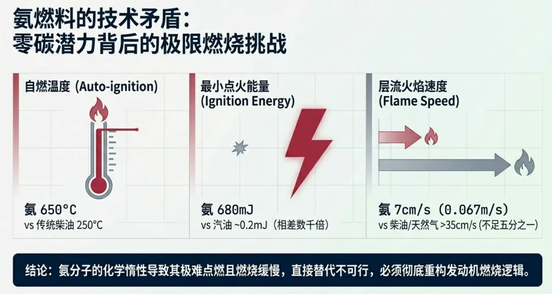 在全球航运体系中,远洋船舶长期高度依赖重油(HFO)和超低硫燃油(VLSFO)作为主动力来源,其温室气体排放量约占全球总排放的2.9%至3%。随着国际海事组织(IMO)确立到 2050年前后实现温室气体净零排放的战略目标,航运业的脱碳逻辑已发生结构性转变:此前依靠船体优化、航速管理以及EEXI、CII等监管机制的路径,只能实现边际减排;航运减排的核心变量已彻底转向“能源结构重构”。在这一背景下,氨(NH₃)从一个全球年产量超过1.8亿吨的基础化工原料,迅速跃升为远洋运输领域的重要候选能源载体。然而,与甲醇等过渡性燃料不同,氨燃料的工程化应用并非简单替代,而是涉及燃烧机理重构、排放副产物控制以及材料体系重建的系统性变革。正是这种强烈的技术张力,使氨燃料成为一个既充满潜力、又充满争议的选择。本报告并不试图粉饰氨的优势,而是首先正视其物理与工程层面的真实难题。氨(NH₃)最具吸引力的特征在于其“燃烧不产生二氧化碳”。与甲醇或合成燃料不同,氨分子本身不含碳元素,因此在理想燃烧条件下不会排放CO₂。从能量密度来看,氨的低热值(LHV)约为 18.6 MJ/kg,虽不及传统重油(HFO,约 40.5 MJ/kg)的一半,但其储运条件极具优势:在常温下仅需施加约 8.6 bar 的中等压力,或在常压下冷却至 -33.4°C 即可液化。这一结构性与物理优势,使其在长航程、重载的远洋商船领域,比需要 -253°C 极低温储运的液氢更具工程可行性。不仅显著降低了储罐的结构复杂性与冷链成本,还使其体积能量密度达到了液氢的约1.5倍。在船舶货舱空间高度受限的现实条件下,这种续航能力与空间占用的均衡,使其更容易直接复用现有LPG(液化石油气)船的港口储运体系,极大降低了基础设施重建的沉没成本。从产业基础看,氨拥有全球性的成熟生产、储运和贸易体系。现有液氨船队、港口终端与储罐网络,为未来燃料转型提供了一定的物理基础。第一,氨具有强烈毒性与腐蚀性。航运业作为一个高度安全敏感行业,任何系统改造都必须通过严格的工程验证。在国际海事组织(IMO)的最新安全框架下,船舶必须设置严密的泄漏监测体系,并在25ppm时触发局部警报,110ppm时触发全局撤离警报,达到220ppm时将强制触发系统紧急关断(ESD)。第二,氨的燃烧副产物问题。虽然氨燃烧不产生CO₂,但若燃烧控制不当,极易生成氧化亚氮(N₂O)。N₂O是一种在100年时间尺度上,其全球变暖潜能值(GWP)高达CO₂273倍的强效温室气体。因此,氨并非天然“完美燃料”,其环保优势必须建立在精密燃烧控制与催化后处理系统(如SCR与氨逃逸催化剂ASC)的基础之上。从燃烧科学角度看,氨具有极强的化学稳定性和“动力学惰性”,其燃烧特性对传统发动机设计逻辑提出了系统性挑战。首先是点火门槛极高。氨的自燃温度高达约650°C,而传统柴油的自燃温度仅为230°C - 250°C。这意味着,在压燃式(CI)发动机中,仅依靠活塞压缩空气产生的高温极难使氨气自主着火。即使在火花点火(SI)系统中,氨的最小点火能量也高达680mJ,远超传统碳氢燃料(如汽油仅需约0.2mJ)。同时,氨在空气中的可燃极限非常狭窄(14%-27%),这要求引入高能点火装置或预燃室(Pre-chamber)技术。更具挑战性的是,氨的层流火焰传播速度仅约为0.067 m/s(即7cm/s),不足柴油或天然气(约35-40cm/s)的五分之一。燃烧速度过慢,会导致燃烧周期延长、循环变动率(COV)上升、热效率下降,并可能在排气门开启时燃料仍未燃尽,从而引发严重的“氨滑移”(未燃氨排入大气)问题。正因如此,当前主流的商业化技术路径普遍采用高压双燃料直喷(HP-DFI)结构。以大功率二冲程主机为例,通常利用仅约5%(能量占比)的柴油作为引燃剂,在高达600bar的喷射压力下引燃剩余95%的氨燃料。这种工程妥协,并非理想状态下的纯氨燃烧,而是在点火稳定性、热效率与排放之间取得的现实平衡。面对这些动力学瓶颈,工业界给出了两套截然不同且高度工程化的解法:在大功率远洋主机中,广泛采用高压双燃料压燃技术。以 WinGD等为代表,通过内置压力放大器将氨燃料增压至约600bar进行精细雾化,并喷入约5%的高十六烷值柴油作为引燃核心,从而在全负荷工况下稳定触发高达95%的氨主燃烧过程。为了克服氨反应活性不足,业界前沿开发了“在线重整”技术。即利用发动机排气余热,在450°C–550°C条件下通过钌基催化剂裂解部分氨气,实时生成极易燃烧的氢气(最小点火能量仅0.016mJ)并回输进气系统。结合预燃室的湍流射流点火机制,通过分布式高温火焰射流,显著加快了主燃烧室内的燃烧速度并拓宽了稀薄燃烧极限。如果说燃烧问题是动力学挑战,那么氨燃料对发动机材料体系的重构要求则更为苛刻。氨在不同物理状态下均表现出显著的化学活性。在燃料供应与常温储运层面,氨对铜及其合金具有毁灭性的腐蚀作用。暴露在氨环境中的铜质火花塞垫片及铜铅合金轴承会迅速发生严重质量损失甚至溶解,因此,在整个燃料系统中必须全面淘汰铜、黄铜、青铜及锌基合金。同时,氨的溶剂效应会导致传统丁腈橡胶和氯丁橡胶发生溶胀与软化,工业界必须全面改用化学惰性极强的特种聚合物,如PTFE(聚四氟乙烯)、FKM(氟橡胶)EPDM(三元乙丙橡胶)及极其昂贵的Kalrez(全氟醚橡胶)来保障密封组件的安全。在高温燃烧室环境(如排气阀与活塞顶)中,氨分解产生的高活性游离氮原子会渗入金属晶格,引发严重的“氮化”(Nitridat