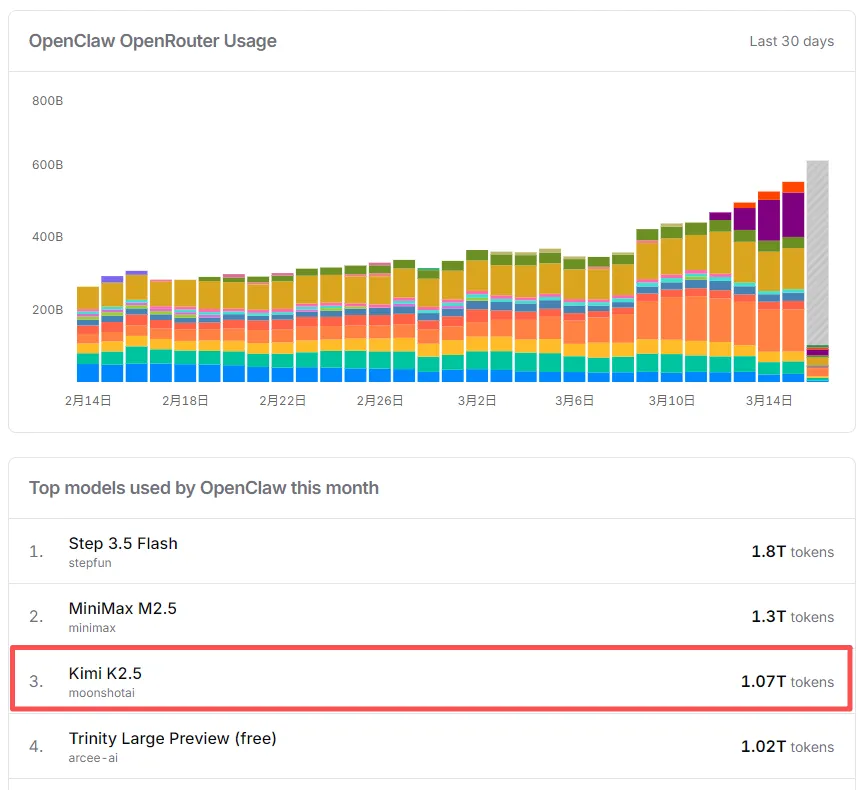 AI模型聚合平台OpenRouter的公开数据显示,仅该平台上OpenClaw最近一个月的Kimi K2.5调用量就达到1.07T Token(万亿次)。这数字背后是海量算力需求和真金白银的变现。