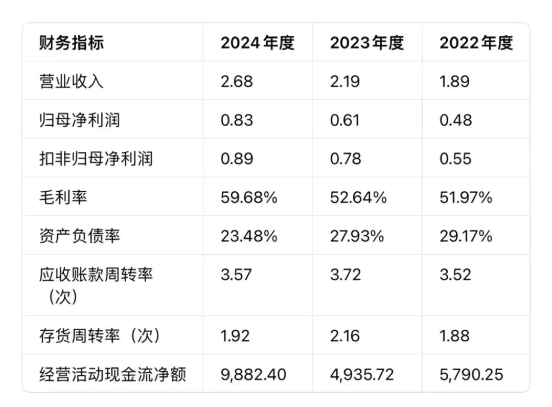 2022-2024年,公司营业收入从1.89亿元增长至2.68亿元,复合增长率18.98%;归母净利润从4792.34万元增至8342.33万元,盈利增速高于营收增速,成长性突出。