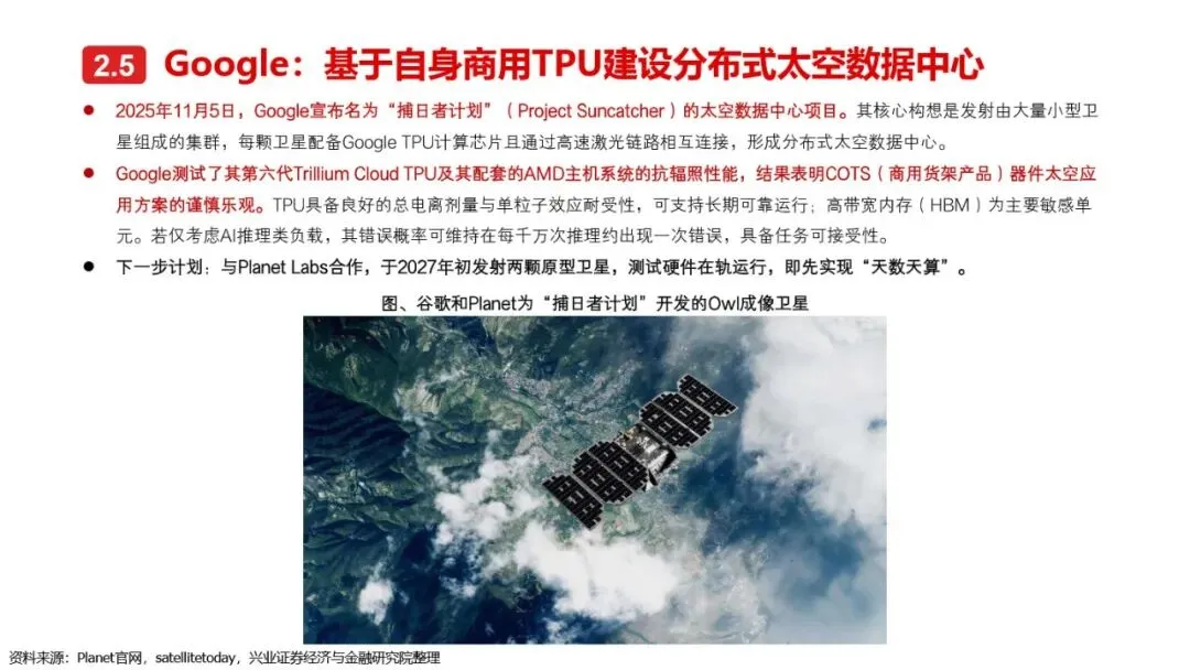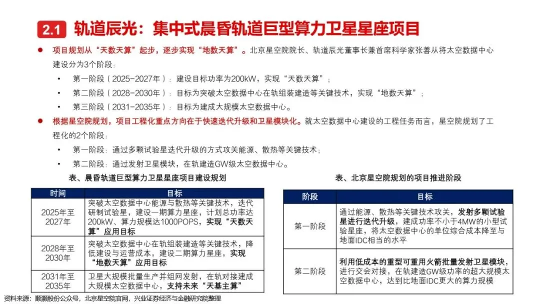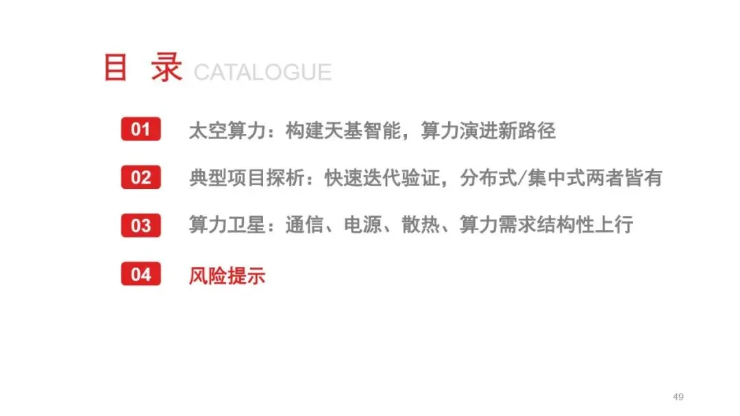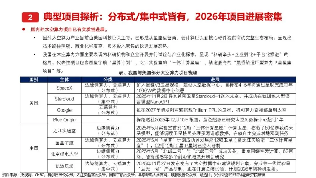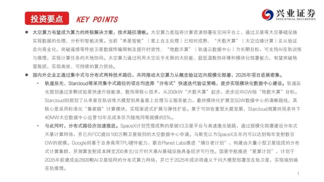 太空算力作为算力领域的终极解决方案,正逐步从概念走向现实。通过部署在空间平台上的计算资源,太空算力利用太空近乎无限的太阳能、超低温散热环境及模块化部署能力,突破了地面算力的瓶颈。国内外企业正通过集中式与分布式两种技术路径,加速推进太空算力项目的落地。从轨道辰光的GW级集中式太空数据中心,到SpaceX的百万颗卫星分布式太空数据中心计划,再到Google的“捕日者计划”,各大项目均展现出太空算力在突破通信瓶颈、提升能源效率及扩展性方面的巨大潜力。随着技术的不断成熟和项目的密集推进,太空算力有望成为未来算力基础设施的重要组成部分。