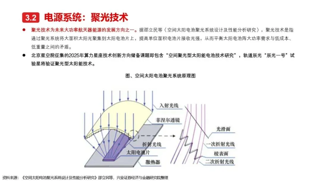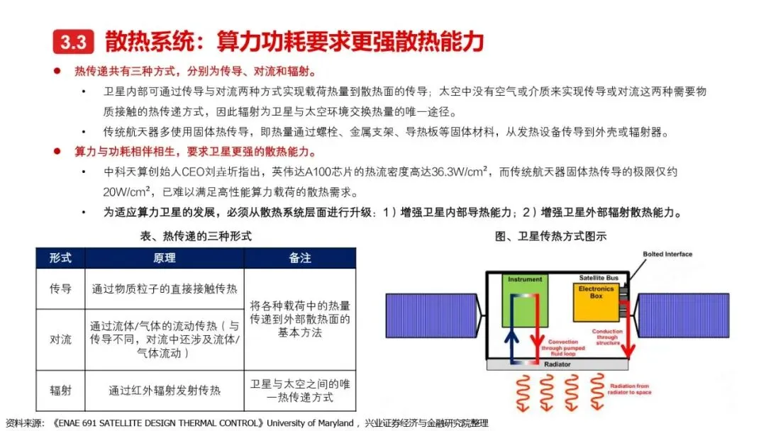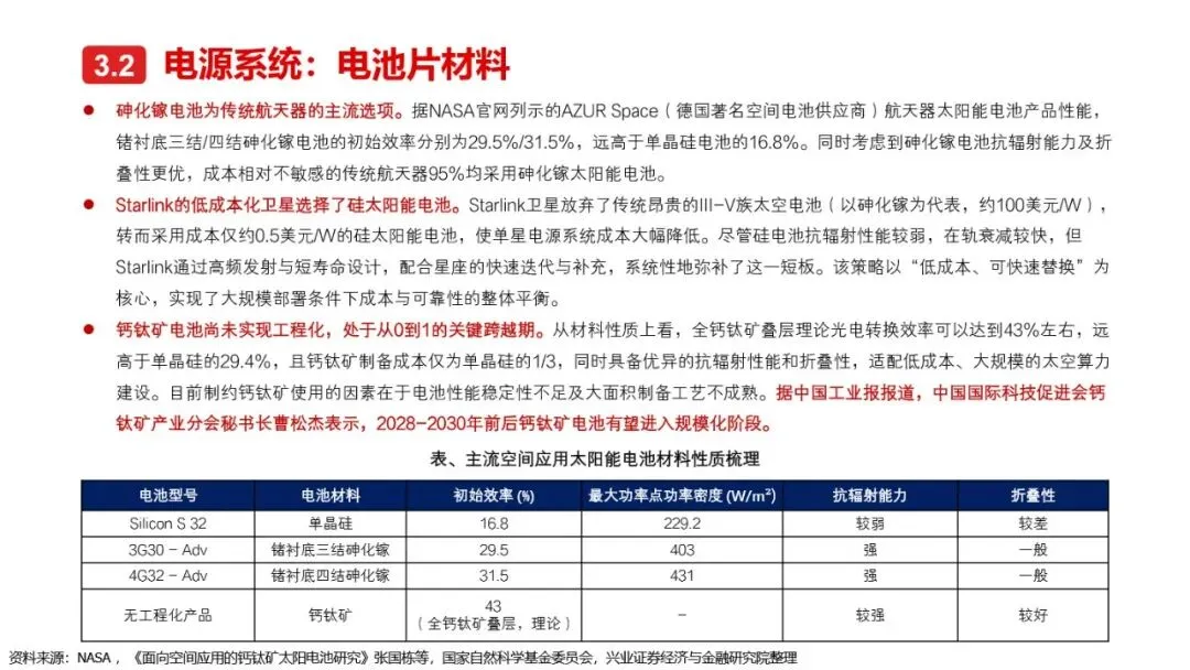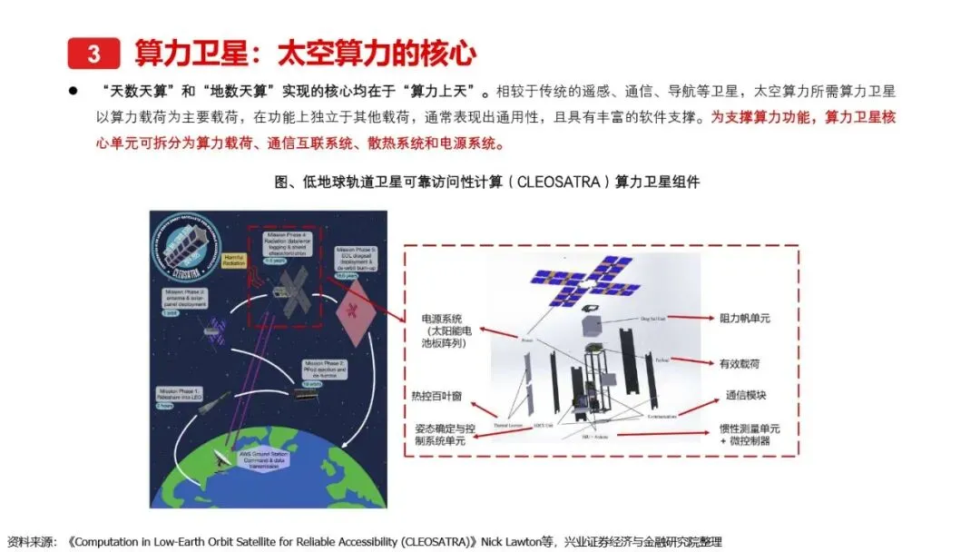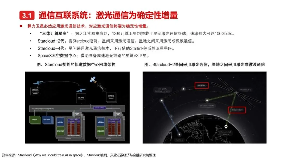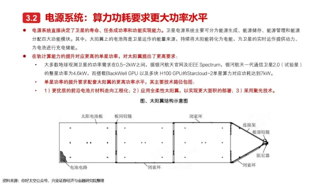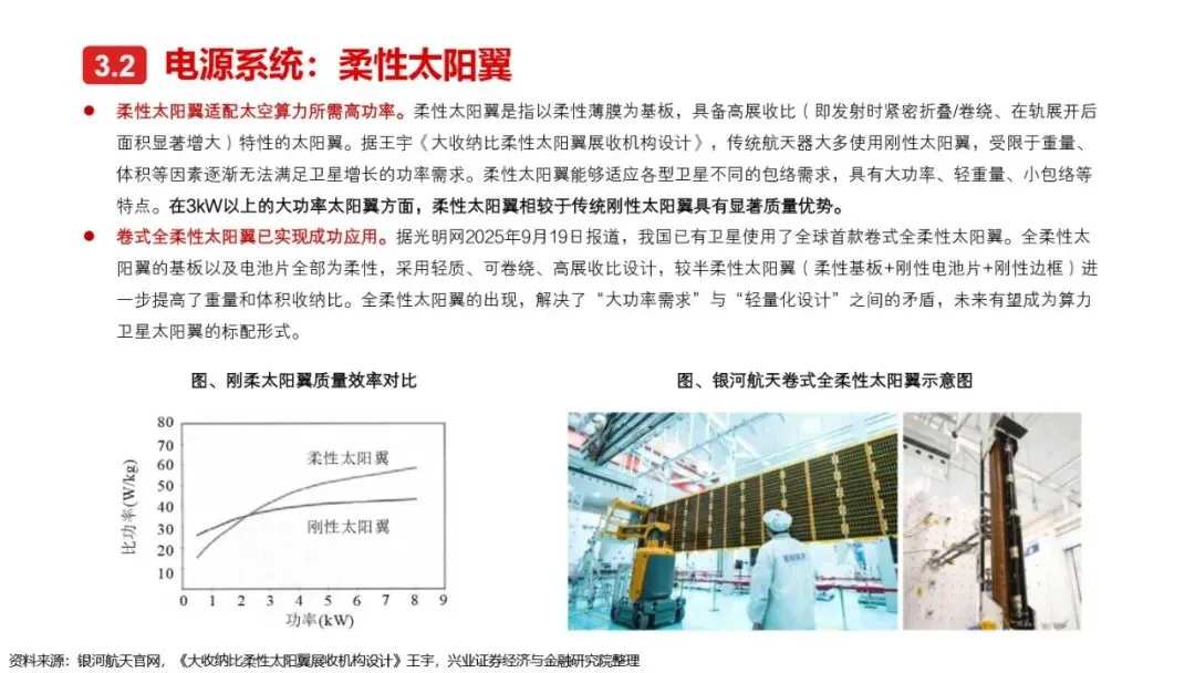 太空算力的实现离不开算力卫星的技术革新与突破。相较于传统卫星,算力卫星以算力载荷为核心,对通信互联系统、电源系统、散热系统提出了更高要求。激光通信作为突破星地与星间通信瓶颈的关键技术,正逐步成为算力卫星的标配。同时,为满足算力卫星高功耗的需求,电源系统需采用更优质的前沿电池片材料、全柔性太阳翼及聚光技术,以提升发电效率和功率水平。散热系统方面,通过芯片级冷却方案、模块间热传输系统及高辐射能力的表面涂层/薄膜等技术手段,有效提升了卫星的散热能力。此外,COTS器件的广泛应用进一步降低了算力载荷的成本,提高了系统的可靠性和灵活性。随着这些核心技术的不断突破,太空算力正朝着高效、可持续的方向迈进。