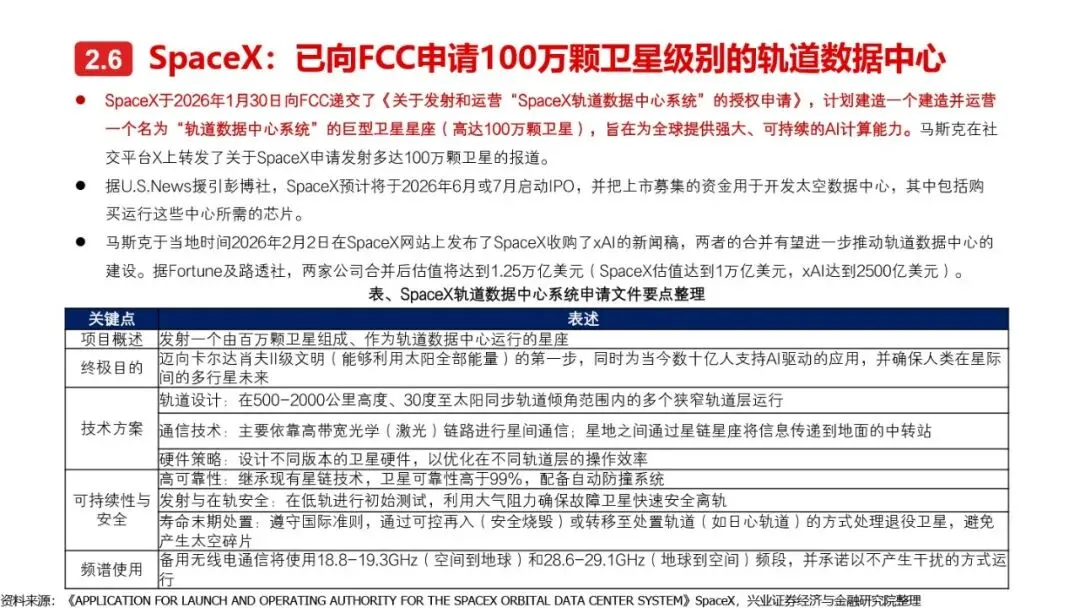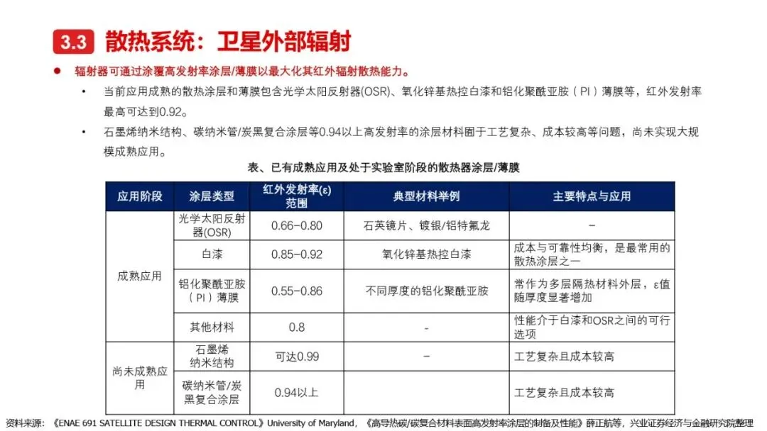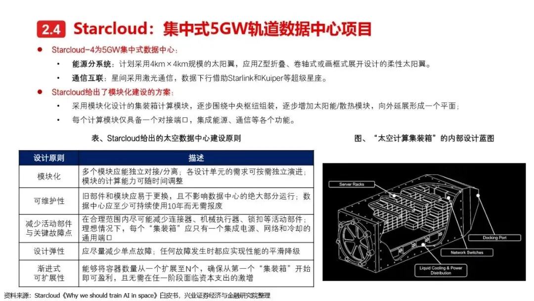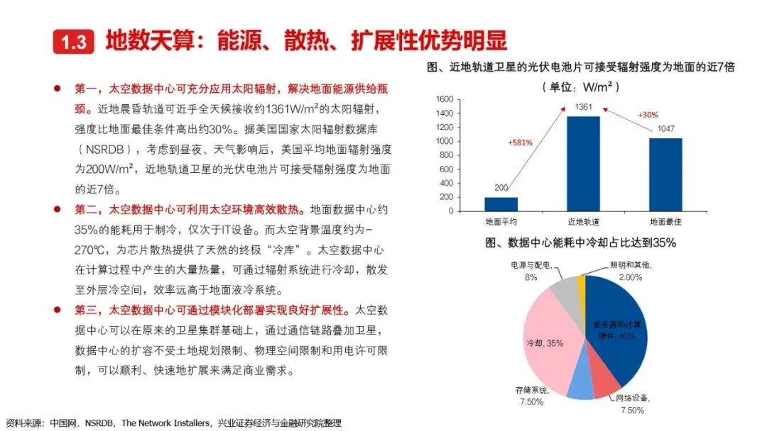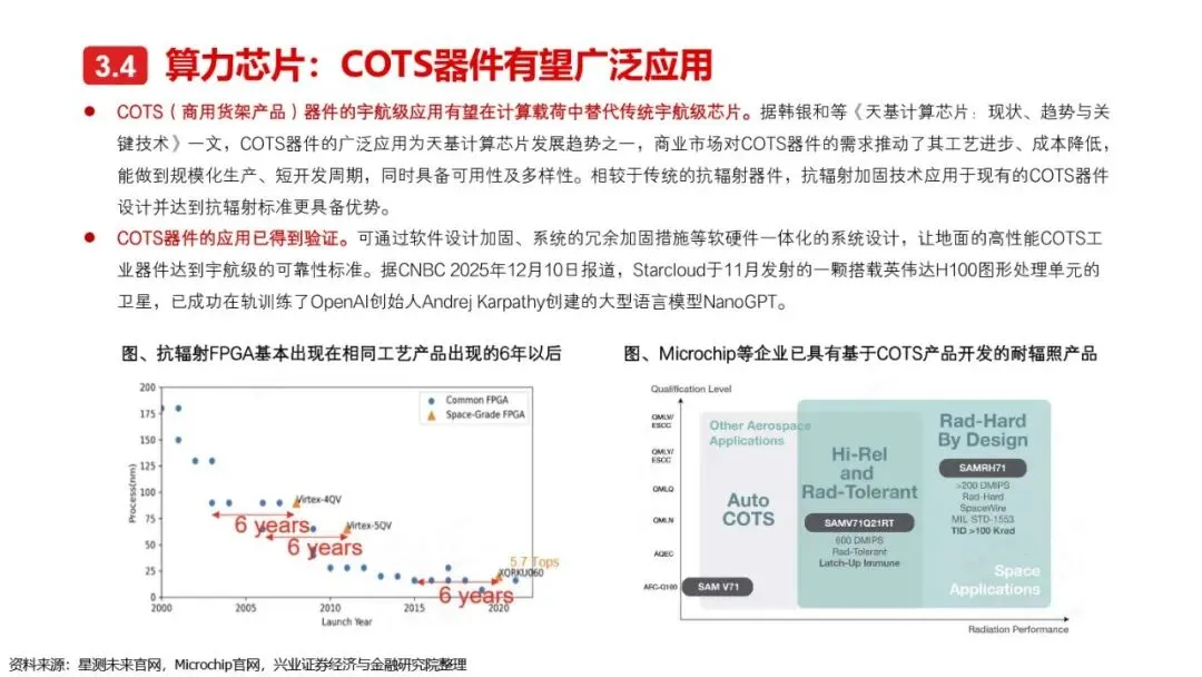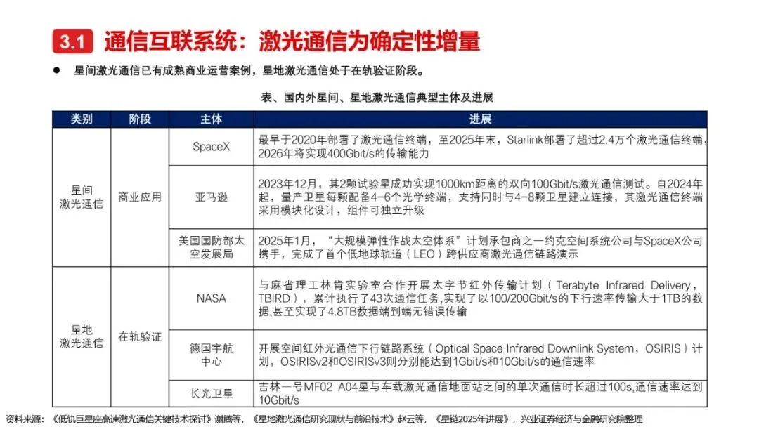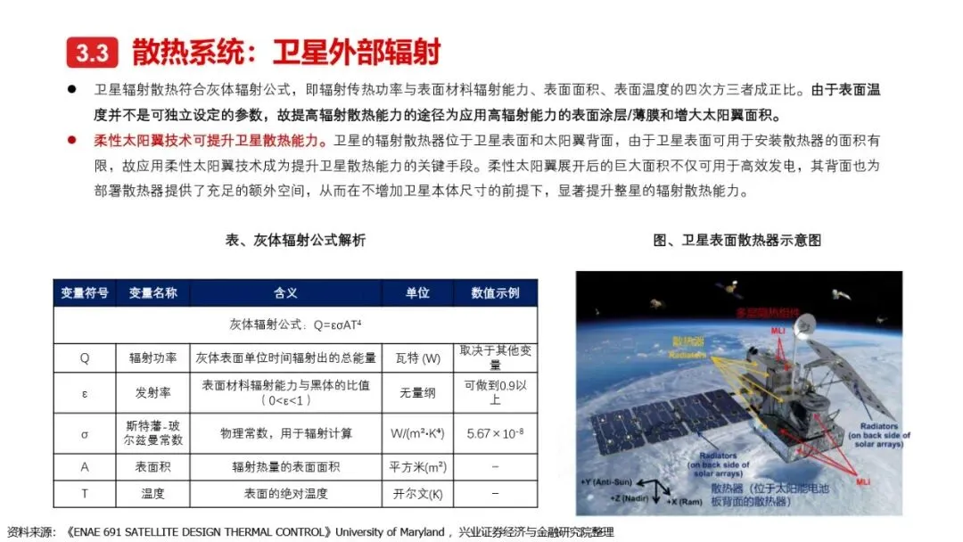 太空算力的实现离不开算力卫星的技术革新与突破。相较于传统卫星,算力卫星以算力载荷为核心,对通信互联系统、电源系统、散热系统提出了更高要求。激光通信作为突破星地与星间通信瓶颈的关键技术,正逐步成为算力卫星的标配。同时,为满足算力卫星高功耗的需求,电源系统需采用更优质的前沿电池片材料、全柔性太阳翼及聚光技术,以提升发电效率和功率水平。散热系统方面,通过芯片级冷却方案、模块间热传输系统及高辐射能力的表面涂层/薄膜等技术手段,有效提升了卫星的散热能力。此外,COTS器件的广泛应用进一步降低了算力载荷的成本,提高了系统的可靠性和灵活性。随着这些核心技术的不断突破,太空算力正朝着高效、可持续的方向迈进。