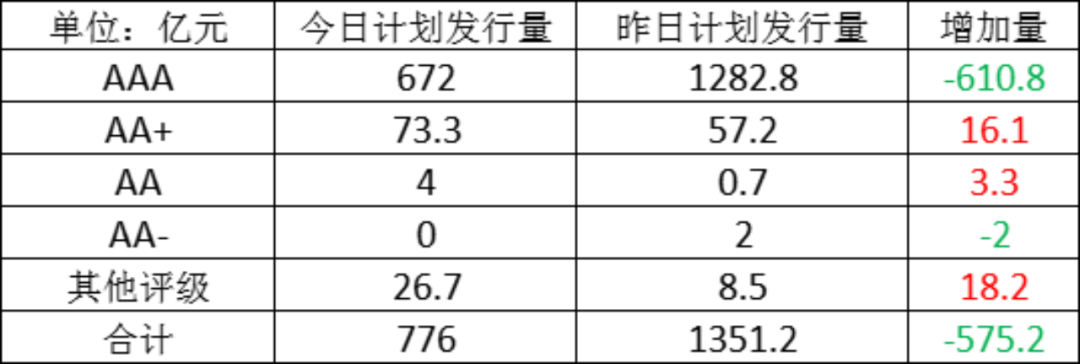 今日存单计划发行量规776亿元,较上一工作日计划发行量大幅减少,减少了575.2亿元。