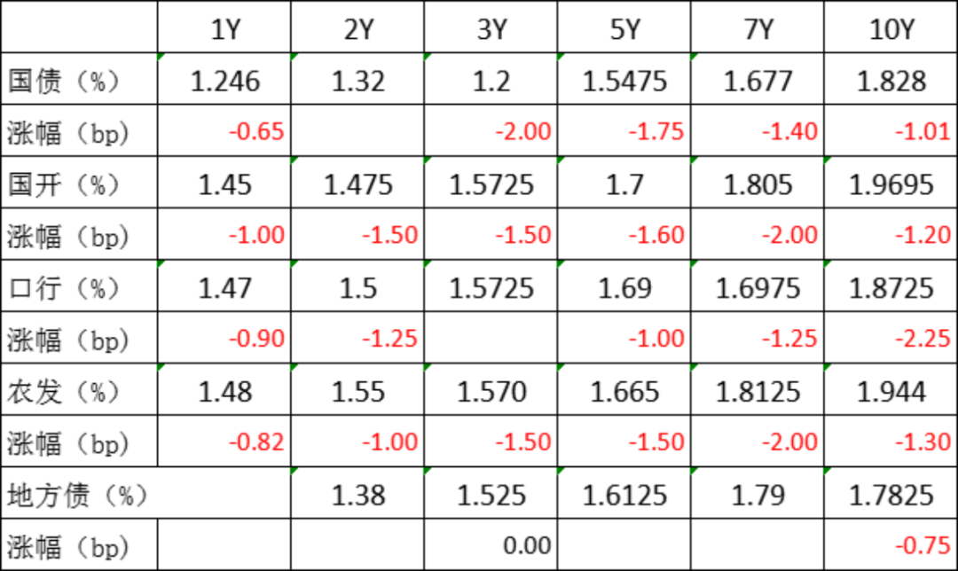 截止17:15,利率债二级市场中,利率成交价格总体呈下跌趋势,其中下跌程度较大的有3年期国债,收益率下跌2bp,报1.2%;7年期国开债,收益率下跌2bp,报1.805%;5年期国开债,收益率下跌1.6bp,报1.7%,10年期口行债,收益率下跌2.25bp,报1.8725%。