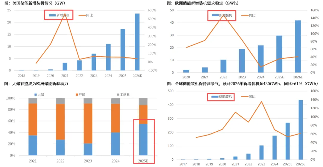 在Ai浪潮下,当前美国AIDC装机功率已达到50GW+,根据储能网数据,美国AIDC用电需求比例已达到接近10%。根据iFind预测,2026年美国储能新增装机有望达到23.7GW、同比+37.7%。欧洲主要驱动因素为高风光渗透率下配储需求与表前侧储能配置提高电网安全性,重心逐步由户储向表前侧储能转移。根据SPE预测,2026年欧洲储能预计新增装机41.9GWh、同比+41.1%。