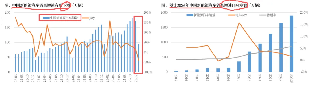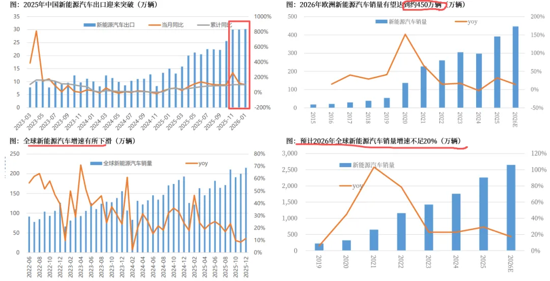 ----欧洲市场展现出强劲协性,根据Find数据,2025年欧洲新能源汽车销量达到391.5万辆、同比+32.1%,高增长主要来源于:欧洲各国电车补贴卷土重来,德国政府重启电动汽车补贴,法国实施电动汽车“生态补贴”,展望2026年,欧洲新能源汽车市场销量有望同比+149%。美国电车市场仍持续下滑。根据iFind数据,2025年美国新能源汽车销量为149.5万辆、同比-3.0%,全球角度看,预计2026年全球新能源汽车销量达到2650万辆、同比+17.3%。