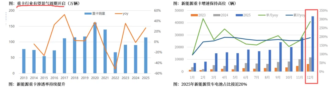 根据数据,2026年中国新能源汽车预计销量为1900万辆、同比+15.2%。新能源汽车销量增速下滑压制动力电池需求,重卡电动化为重要驱动力,2026年预计中国电动重卡销量达到35万辆、同比+66.7%。根据商车邦数据,当前电动重卡平均带电量在450度左右,在2026年对应电池需求接近160GWh,成为中国动力电池重要增长极。