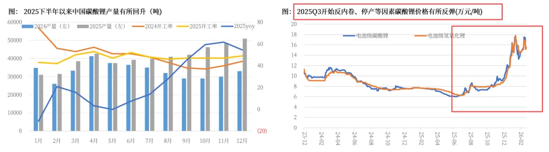 ----锂电产业链2025年以来明显修复,电池材料环节呈现量价齐升格局,有望率先实现业绩修复。根据iFind数据,2025年中国碳酸锂产量达到48.9万吨、同比+23.0%,2025年碳酸锂价格同比+56.2%,2026年价格中枢有望进一步提升;根据EV Tank数据,2025年中国正极材料出货量为498.7万吨、同比+51.5%,其中铁锂出货394.4万吨、同比+62.5%,三元正极出货78.6万吨、同比+22.2%。价格方面,2025年铁锂价格同比+23.7%;2025年中国负极材料出货量292.2万吨、同比+38.2%,中端人造石墨负极2025年价格同比+25.0%;2025年中国电解液出货量达到223.5万吨、同比+46.4%,2025年电解液价格率先启动,年同比+50.0%,供需关系优先紧张;2025年中国隔膜出货量达到328.5亿平、同比+44.49%,随着储能行业对大电芯需求提升,干法或将逐步向湿法切换,隔膜有望在2026年迎来供需拐点导致的涨价主升浪。