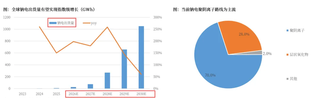 2025年钠电环节正式迎来产业化元年,根据数据,25年全球钠电出货量达到9GWh、同比+150%,分应用领域来看,钠电主要应用领域为储能为主,占比超60%,根据预测,至2030年全球钠电出货量有望达到1051.0GWh。