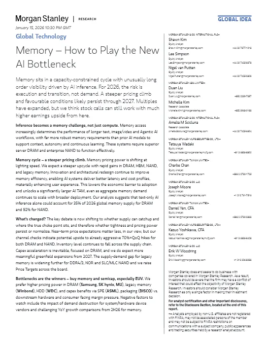 今天分享的这份摩根士丹利2026年发布的全球存储领域研报,核心围绕AI成为存储行业核心驱动力,内存取代算力成为AI新瓶颈展开,明确2026-2027年存储行业将处于产能受限、价格陡峭上涨的超级周期,同时给出了细分领域投资标的与核心风险,解读如下: