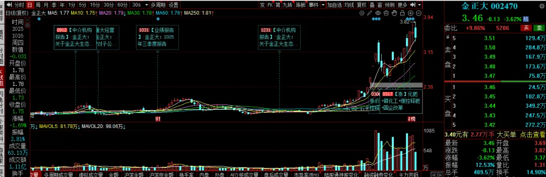 核心结论:金正大是国内缓控释肥绝对龙头、磷化工全产业链标的,2025 年 Q3 单季盈利暴增 316%,2025 全年扭亏、2026 年净利1.5-2 亿元。核心驱动:地方国资入主 + 马路槽磷矿投产 + 春耕旺季 + 新能源材料,目标价4.5-5.8 元,困境反转 + 估值修复高弹性标的。