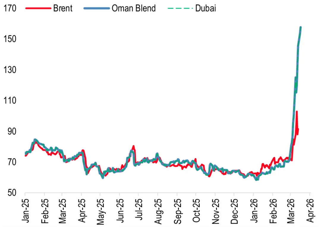 相比之下,中东地区的基准价格,如迪拜原油和阿曼原油,更能准确反映当前的实际供应紧张状况。报告数据显示,迪拜和阿曼的现货价格已飙升至每桶155美元左右,显示出霍尔木兹海峡出口受阻带来的巨大供需缺口。