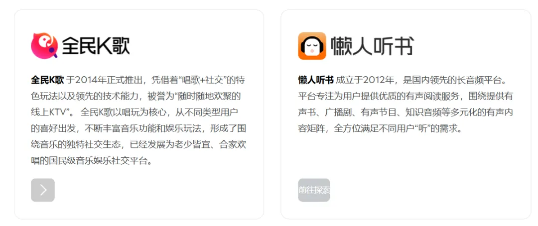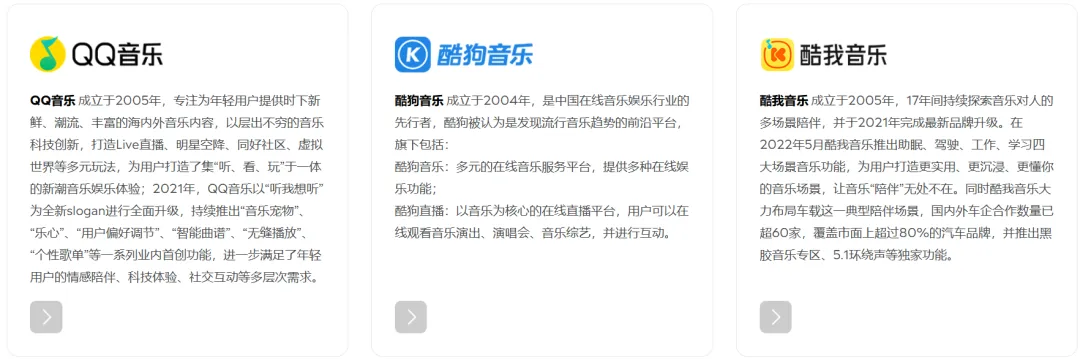 酷我音乐:早期以车载音乐和长音频见长,目前更多承担垂类场景覆盖的角色,尤其在车载、智能硬件等IoT领域有深厚积累。